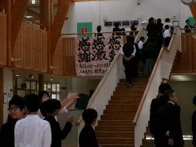 修学旅行で交流した友達との再会を喜んだり、中学生の説明や案内を真剣に聞いたりして、