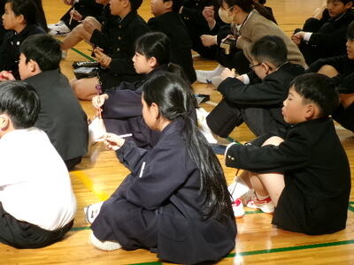 縦割り班で豆を箸でつかむゲームにも挑戦しました。