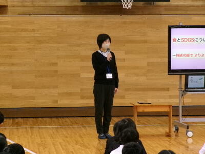 最後には、給食センターの田邊栄養教諭から、食べ物の命をいただくことについてお話をしていただきました。