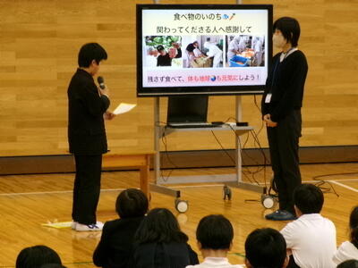 この日は、給食委員会主催の給食集会がありました。